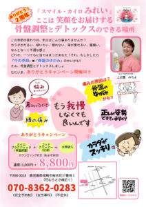 この度、4月22日にて『スマイル・カイロみれい』開業して2周年を迎えることができました。日頃の出逢いに感謝すると共にこれからも、また新しい出逢えた方々との繋がりを大切にまだまだ未熟ですが、精進させてい
